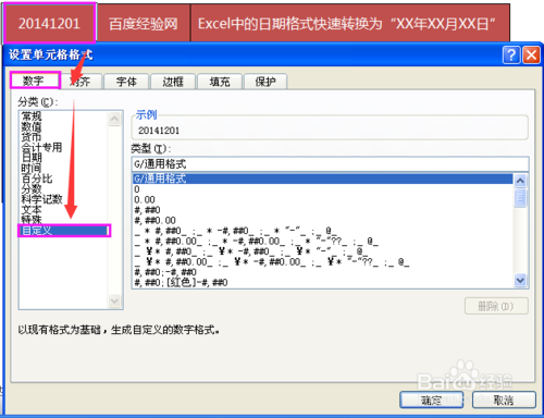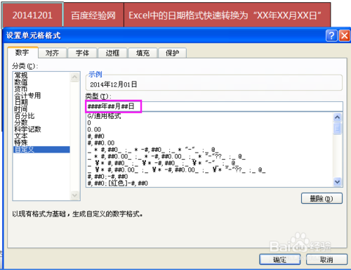 在“設置單元格格式”文本框,將類型填寫為“####年##月##日”。