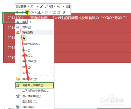 選中需要做日期轉換的“20141201”,鼠標右鍵選擇“設置單元格格式”。