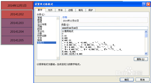 選中B5-B8的表格,右鍵“設置單元格格式”,將數字選項卡下的“自定義”一項的類型設置為“####年##月##日”,如圖所示。