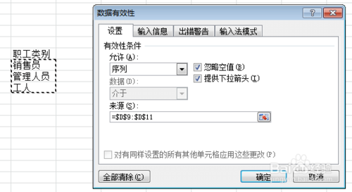 對話框出來后,設置有效性條件允許“序列”,數據來源為“銷售員,管理人員,工人”(中間間隔符號為英文標點符號)