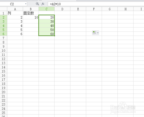 2、假設(shè)是A列,要剩固定數(shù)(10),那么在輸入C2=A2*$B$2,修改B2,確定回車后,用鼠標(biāo)放在單元格的右下角黑點(diǎn)處,呈黑十字時(shí),向下拉動(dòng)鼠標(biāo)填充。c列就是你要 。如圖下