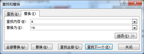 3、查找內(nèi)容輸入A,替換為輸入=A,最后按全部替換即可