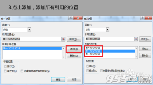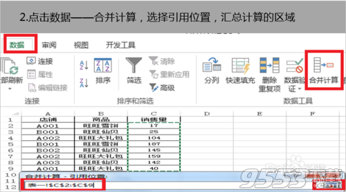 2.點擊數據——合并計算,選擇引用位置,匯總計算的區域。
