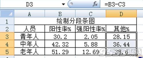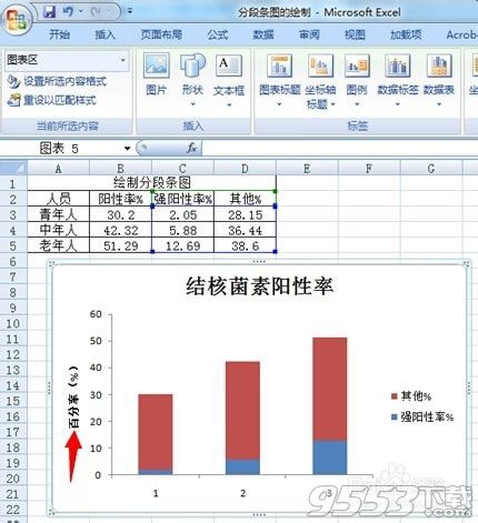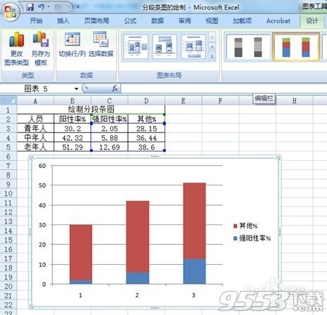 發現沒有,這里是采用Excel 2007中的柱形圖來繪制分段條圖。