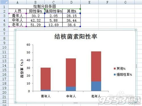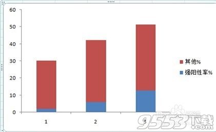 強陽性率為陽性率的一部分,因此可以將陽性率分解為強陽性率與其它兩個組成部分,整個直條代表陽性率,所以該數據資料宜繪制分段條圖來分析。