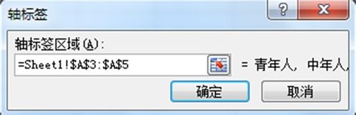 8、單擊【選擇數據源】對話框右側的【水平(分類)軸標簽】下的【編輯】按鈕,彈出【軸標簽】對話框,此時單擊A3單元格,拖動鼠標選中A3:A5單元格區域,在【軸標簽】對話框的【軸標簽區域】顯示“=Sheet1!$A$3:$A$5”。