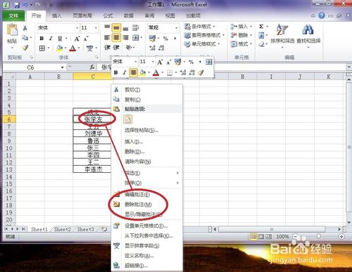 5、當你發現你的批注不完整或批注錯誤需要修改的時候,你可以再次選定該單元格或文學,點擊右鍵,在右鍵菜單中選擇“編輯批注”或“刪除批注”或:顯示/隱藏批注“,重新設置即可。