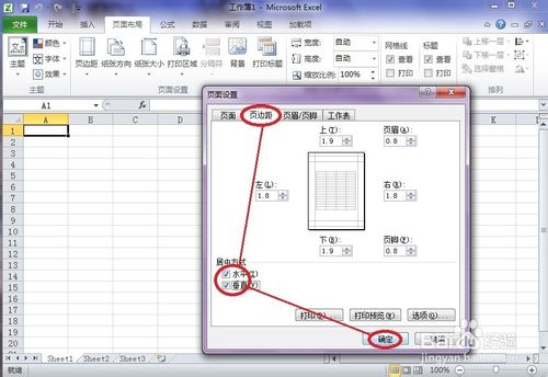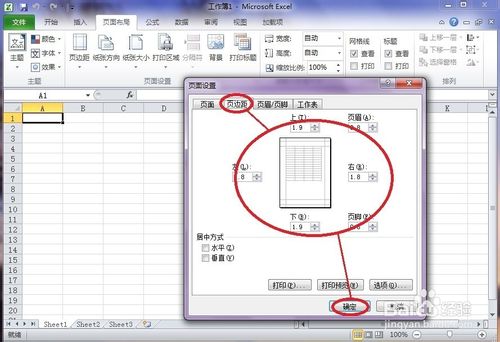 4、在頁面設(shè)置對(duì)話框中點(diǎn)擊”頁邊距“,再各輸入”上、下、左、右“幾個(gè)方向的邊距值,最后點(diǎn)擊”確定“。