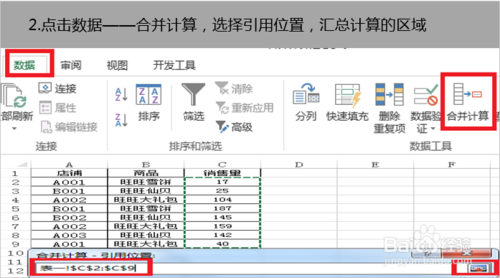 2.點擊數(shù)據(jù)——合并計算,選擇引用位置,匯總計算的區(qū)域。