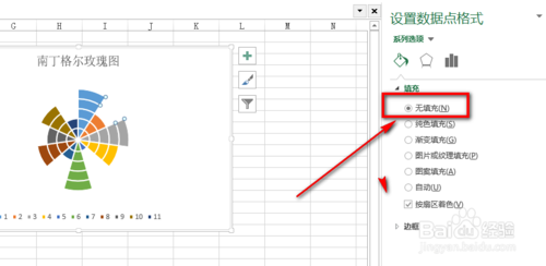 5、接下來是重點,我們利用顏色填充 來做所要做的圖表,我們點擊圓環 ,然后雙擊某一個單獨的環——右鍵——設置數據系列格式(或者直接選擇填充)——選擇無填充或者純色填充為白色 ,這樣一個一個做實在是太慢,那么我們就要善于運用F4鍵 ,這樣會事半功倍