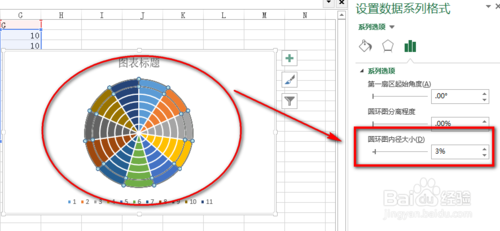 4、接下來我們右鍵圖表——設置數據系列格式 ,在右側窗口中將圓環內徑大小調為3%左右,其結果如下圖