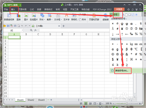 7、進入excel中,點擊“插入”,點擊“符號”后面的倒三角形,點擊“其他符號”。