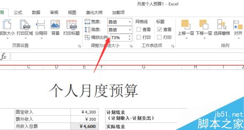 8、也可以在【頁(yè)面布局】選項(xiàng)卡,【調(diào)整為合適大小】欄中選擇【縮放比例】來(lái)控制打印內(nèi)容,效果跟【將工作表調(diào)整為一頁(yè)】差不多,只不過(guò)這樣設(shè)置更靈活,可以在一張紙上打印出不同的效果。【縮放比例】越小,一張紙上打印的內(nèi)容就越多。
