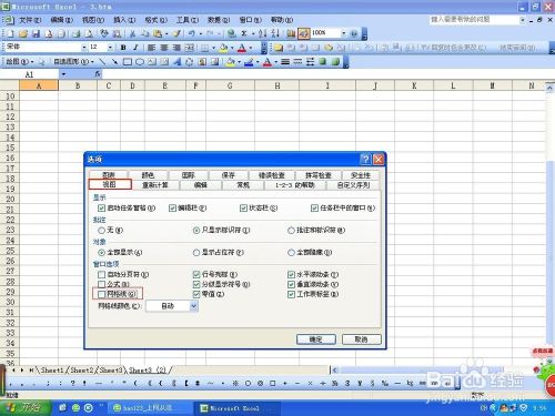 隨即彈出【選項】窗口,點擊【視圖】菜單標簽,在【窗口選項】中的【網格線】復選框中的“鉤”取消掉,如圖所示