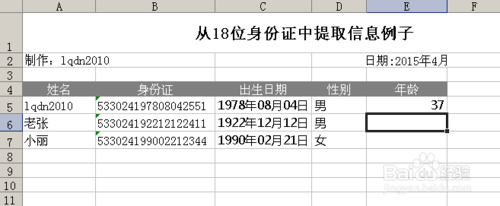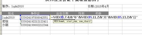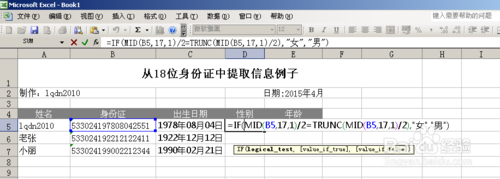 18位的新一代身份證了,里面的數字都是有規律的。前6位數字是戶籍所在地的代碼,7-14位就是出生日期。第17位“2”代表的是性別,偶數為女性,奇數為男性。我們要做的就是把其中的部分數字利用了涵數“提取出來”。