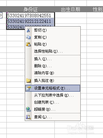 輸入的身份證號會以科學記數法顯示,需要更改一下數字格式。選中該列中的所有身份證號后,右擊鼠標,選擇“設置單元格格式”。在彈出對話框中“數字”標簽內的“分類”設為“文本”,然后點擊確定。
