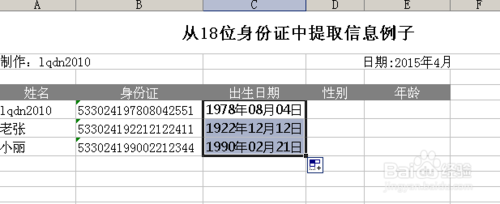 回車后,你會發現在C5單元格內已經出現了出生日期。然后,選中該單元格后拖動填充柄,其它單元格內就會出現相應的出生日期。