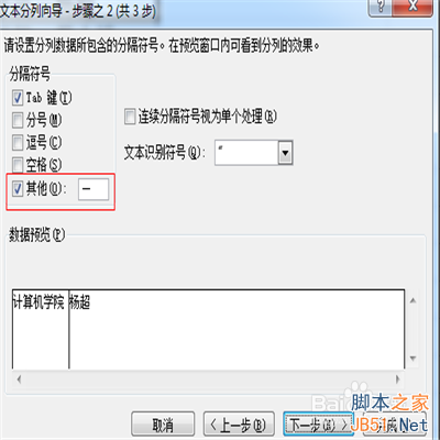 5、然后進入第二個對話框,注意如下圖所示填寫,在分隔符中選擇"其他",并填入符號"-",然后點擊"下一步"進入第三個對話框,這時候我們點擊"完成",可以看出我們完成了數據的分列