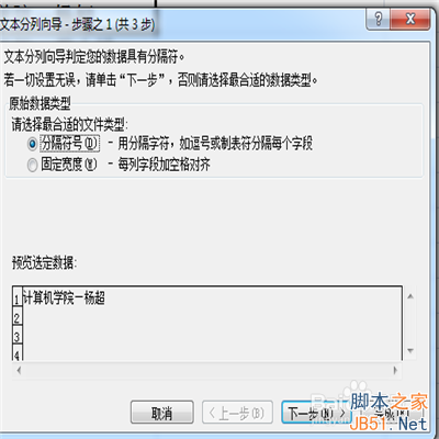 4、點擊"分列"即打開"文本分列向導"對話框,在第一個對話框下點擊下方"下一步"