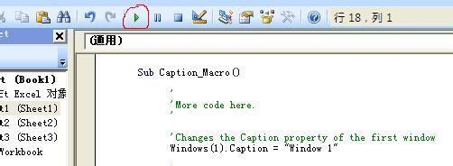 5、 運行以上那段代碼,運行方法:點擊那個綠色的三角形按鈕(類似播放按鈕,見下圖紅色圈內標注),或者按鍵盤上的F5鍵,彈出運行宏的對話框,選擇宏Caption_macro,然后單擊運行。