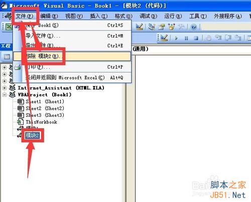 5、如果要?jiǎng)h除工程資源管理器中多余的模塊2或模塊1 首選在工程資源管理器中鼠標(biāo)左鍵點(diǎn)擊要?jiǎng)h除的模塊 然后點(diǎn)擊菜單欄 文件命令 在彈出的活動(dòng)菜單中點(diǎn)移除模塊2或模塊1