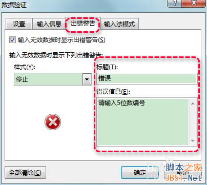 其實,錯誤警告的內容是可以自行設置的,如圖,還是在“數據驗證”,切到“出錯警告”選項卡,然后自行填寫警告標題與內容就可以了。比如小編填寫“標題:錯誤 內容:請輸入5位數編號”。