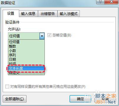 目的是要限定A列輸入的文本個數,所以在“設置”選項卡的驗證條件“允許”里面選擇“文本長度”。