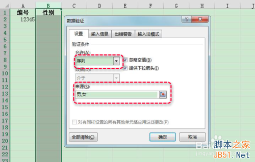 還是在“數據驗證”,驗證條件這里選“序列”。在來源里填入“男,女”(注意逗號“,”為英文狀態輸入)。