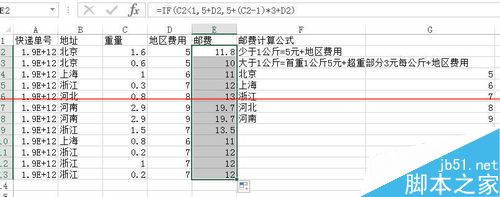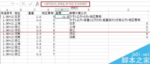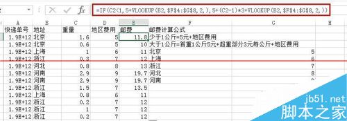 4、接下來,就可以計算郵費了,這里運用了IF函數(shù)(這個之前的經(jīng)驗也是說過,不清楚可以看看),公式如下圖,公式的意思就是,如果大于1則返回5元+地區(qū)費用,如果大于1則返回,5元+超過1以外的乘以3+地區(qū)費用。