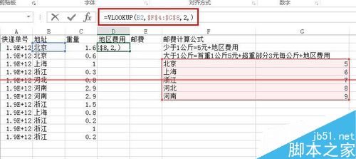 2、首先新建一個輔助列,稱為地區(qū)費用,我們用VLOOKUP把地區(qū)費用都引用過來,公式如圖,如果不了解VLOOKUP函數(shù)的話,可以看之前的經(jīng)驗