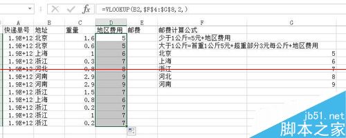 3、然后對數(shù)據(jù)進行下拉,這樣就可以得到全部的地區(qū)費用數(shù)據(jù)