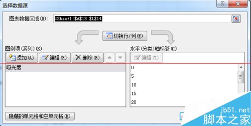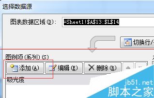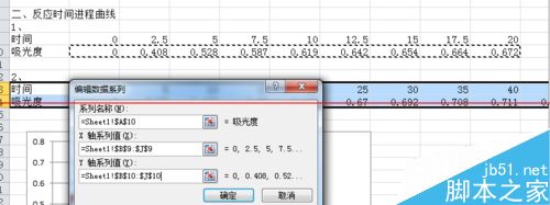 7、在“系列名稱”中選擇數據名稱,此圖為“吸光度”;“X軸系列值”和“Y軸系列值”中分別選擇需添加制作的數據。設置圖如下所示。