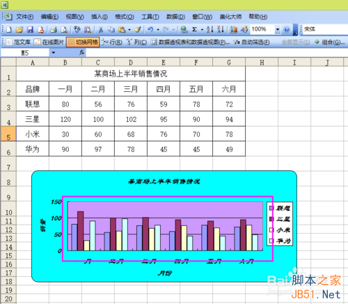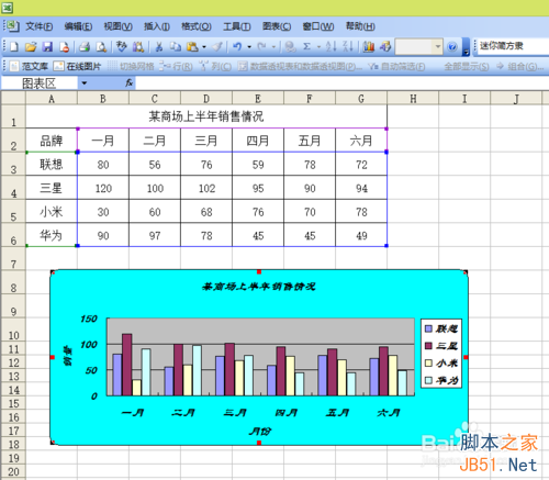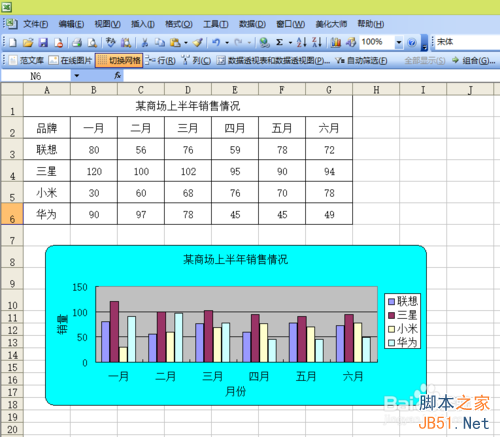1、首先在我們制作出我們需要的表格,第一步選中數據,不要選擇“某商場上半年銷售情況“這一單元格,因為它是已經合并了的。