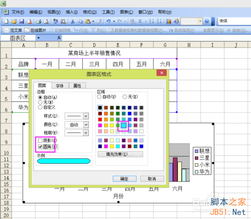 7、現在教大家修改圖表的樣式,雙擊圖表的空白區域,就會彈出一個對話框,可以設置圖表的背景色,改變圖表邊框等。如圖:所設置的圖表背景為藍色,圓角。