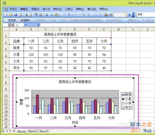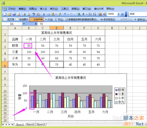 5、表格中數據的更改,圖表也隨之更改。我們可以試一下,把聯想一月份的銷量改為80,來看一下,圖表也隨之改成了80。這說明,圖表和表格之間是完全對應的。