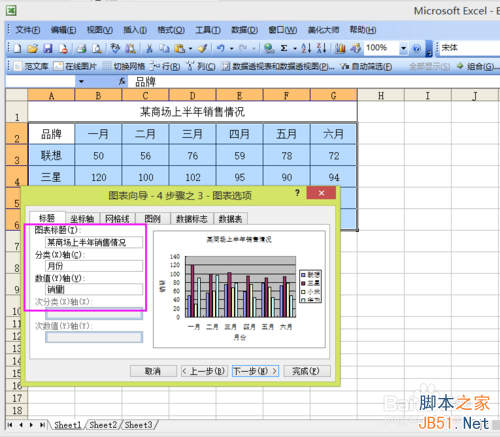 3、在圖表標題內輸入相應的標題,X軸為月份,Y軸為銷量,預覽效果會在右邊顯示出來。