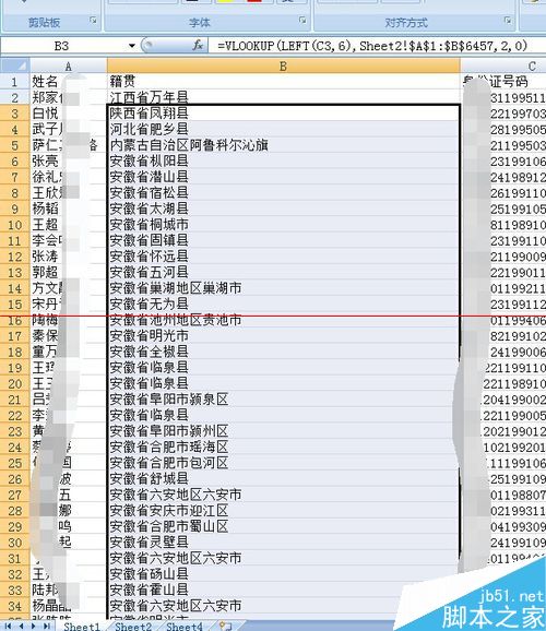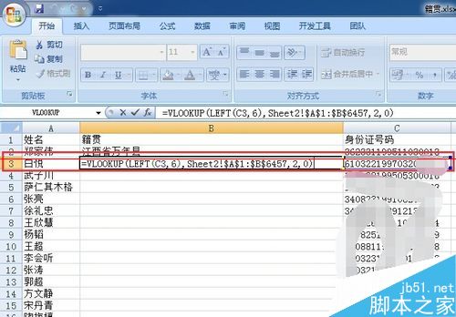 5、最后我們來輸入公式,查找對應的籍貫。“=VLOOKUP(LEFT(C3,6),Sheet2!$A$1:$B$6457,2,0)”
