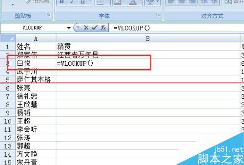 6、現在我們已經輸入好一個公式了。接下來的所有人的籍貫也就簡單多了。只要把鼠標放在剛剛那個輸入好的公式文本框右下角,鼠標變成黑十字架,雙擊鼠標左鍵。這樣下面所有人的籍貫就都出來了