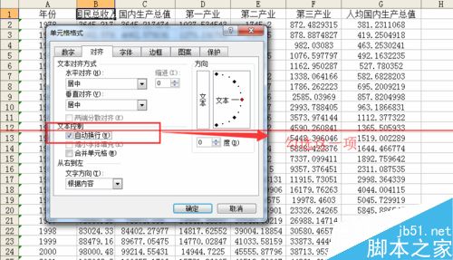2、在彈出的“設置單元格格式“的對話框中,切換到“對齊”的對話框中,勾選“自動換行”。