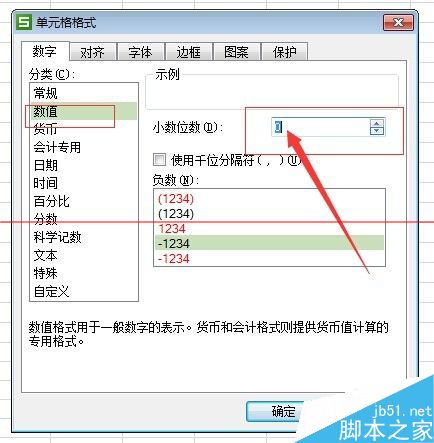 3、在對話框中選擇“數值”小數位數,選擇“0”,點擊確定。