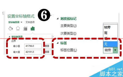 1)選擇X軸,雙擊進入“設(shè)置坐標(biāo)軸格式”;將坐標(biāo)軸最小值定位41796(即第一事件的時間),最大值為42191;將“標(biāo)簽位置”設(shè)為“無”。