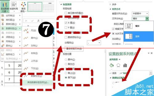 2)彈出的對話框?qū)?ldquo;標(biāo)簽包括”Y值改為“X值”;“標(biāo)簽位置”為“靠下”;文字版式中的“文字方向”為豎排;將“數(shù)據(jù)標(biāo)記類型”選擇“無”。