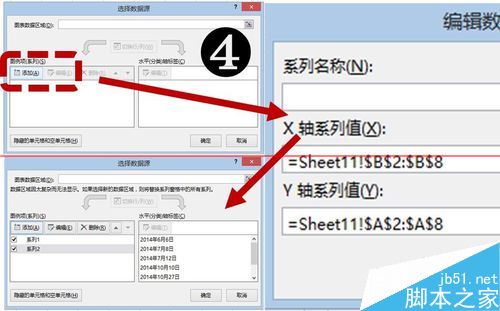 2)在彈出的對話框中,單擊“添加”,X軸系列值選擇“日期”列數(shù)據(jù),Y軸系列值選擇“序號”列數(shù)據(jù);再次單擊“添加”,X軸系列值選擇“日期”列數(shù)據(jù),Y軸系列值選擇“輔助”列數(shù)據(jù)(如下圖二所示)。