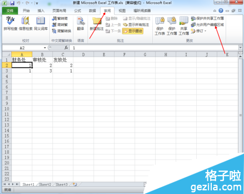 第二步:點擊主菜單上的審閱,點擊允許用戶編輯區域。