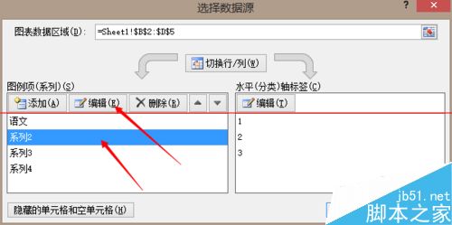 7、編輯系列的名稱。并以步驟4、5的方法選擇水平軸的標(biāo)簽。點(diǎn)擊確認(rèn)