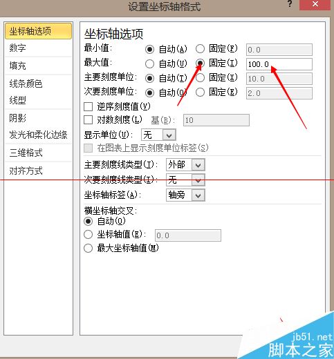 9、將坐標(biāo)軸選項(xiàng)的最大值改為固定100,點(diǎn)擊右下角關(guān)閉