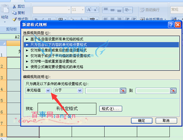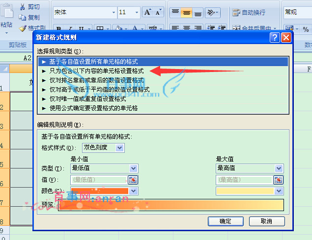 接下來會彈出一個對話框,此時會要求我們選擇規則類型,我們單擊規則類型里面的“只為包含以下內容的單元格設置格式”選項。