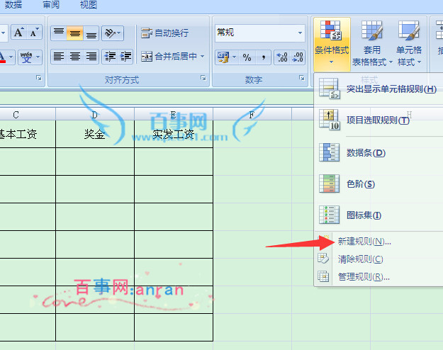然后會下拉選項,在下拉的選項里我們選擇“新建規則”按鈕。