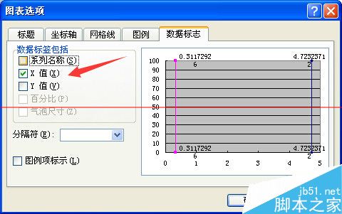 4、在圖表中點右鍵,進入圖標選項-選中數據標志中的X值,如圖所示