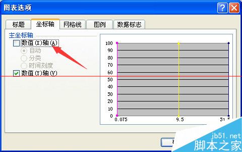 7、打開圖表選項,在坐標軸選項卡中,取消數值X軸